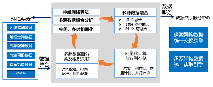 多源数据融合技术的主要优势在于可以取得多角度、多维度的数据信息,从而提高数据的准确性和可靠性。此外,这种技术还可以利用各种数据源之间的相互补充,弥补数据源之间的缺陷,从而提高了数据的完整性和可信度。多源数据融合技术的应用还可以提高环境监测的效率和精度,对于实现智慧城市、环境治理和预警等领域具有重要的意义。          平台对各类环境要素数据,进行同化--融合处理,实现了多源数据的自分类及组织关联,尤其对于时间序列数据与空间数据的融合和同化方面,实现了多时相同化、空间同化和融合校正,并最终实现“时 - 空 - 谱一体化融合”。在此过程中,采用神经网络算法对数据训练校准,对多源数据进行耦合研判分析。